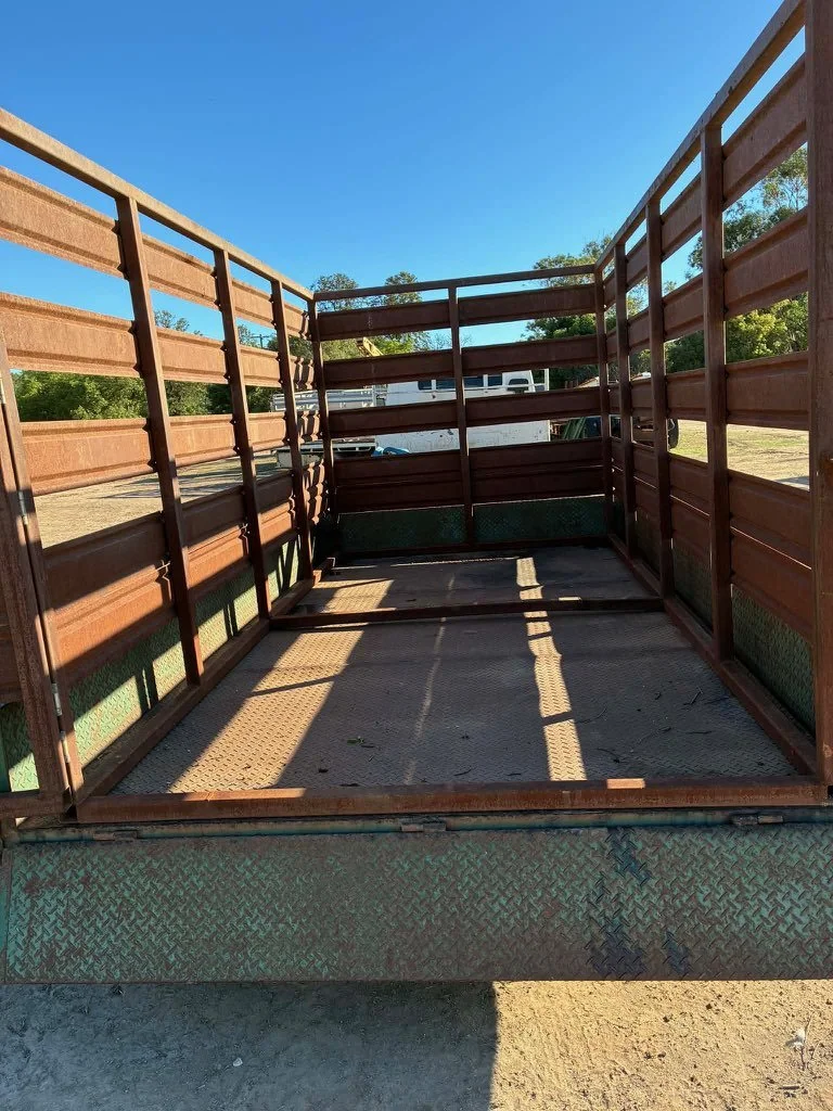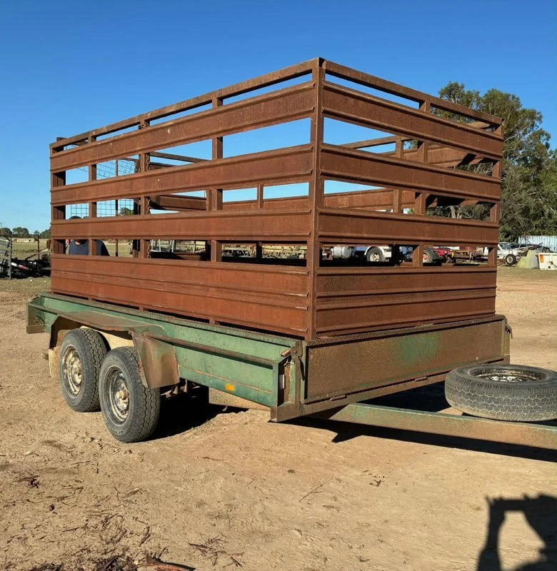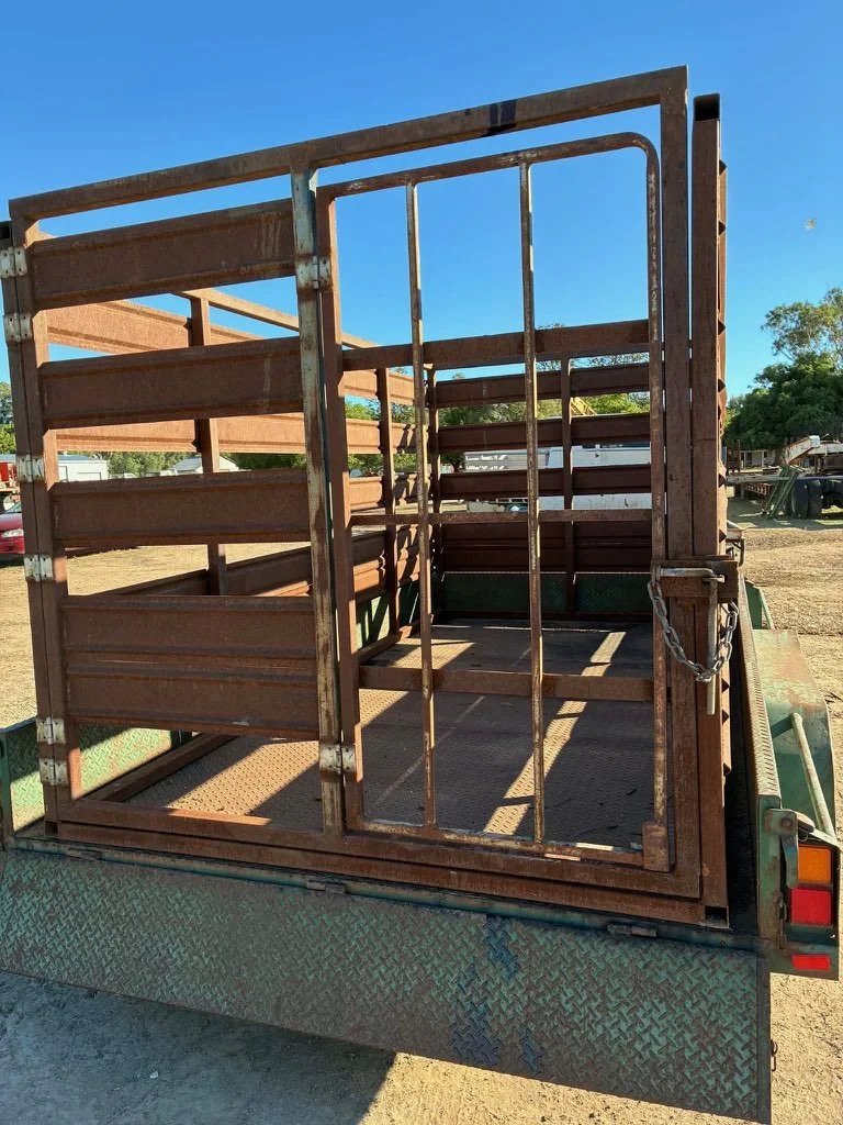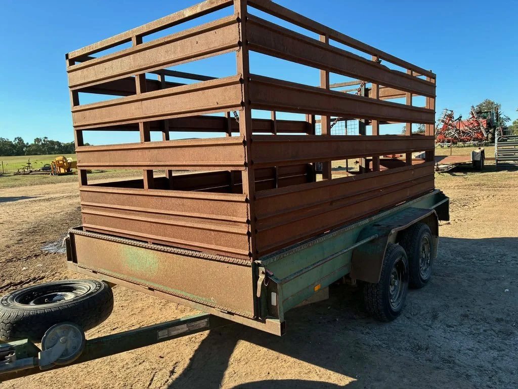 12 x 6ft 6inch tandem trailer & stock crate - check plate, rocker suspension , good tyres all round (NO RUST at all)lhas 12 months NSW rego. Stock crate has half open and full swing open back, hence load large hay bales , quad bike etc.